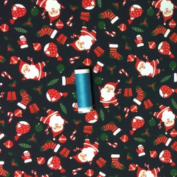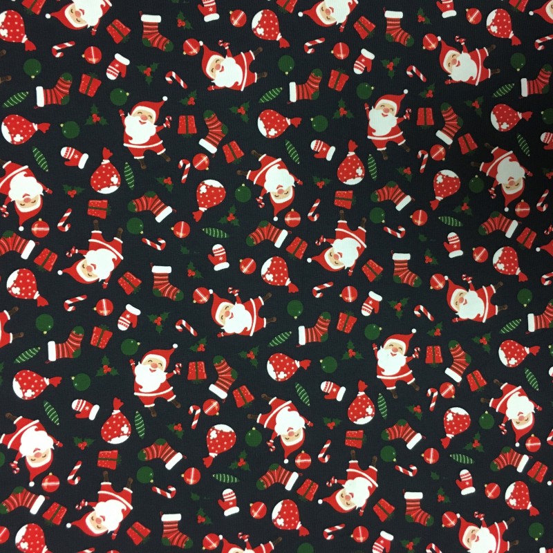 Ett härligt virrvarr av glada små tomtar och jul-prylar. Trikå i 95% bomull 5% elastan. Bredd 150 cm.