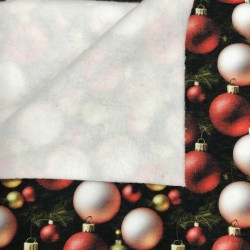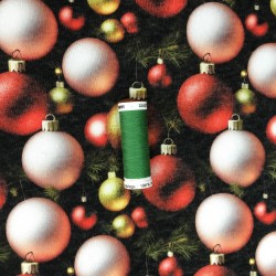 90% bomull 10% polyester. Bredd 150cm. Trådrullen på bilden är 55 mm.