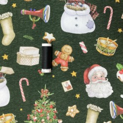 Juliga saker yr runt på detta mörkgröna tyg . Mjuk o lite tjockare trikå till mysiga tröjor, byxor m.m. Flossad, vit avigsida.