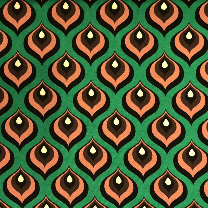 Retromönstrad trikå i 95% bomull 5% elastan. Bredd 150cm. 200g/m2. Trådrullen är 55mm.