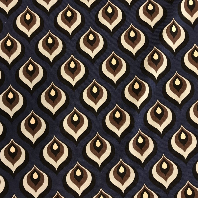 Retromönstrad trikå i 95% bomull 5% elastan. Bredd 150cm. 200g/m2. Trådrullen är 55mm.