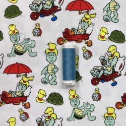 Bredd 150cm. 95% bomull 5% elastan. Trådrullen på bilden är 55mm.