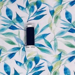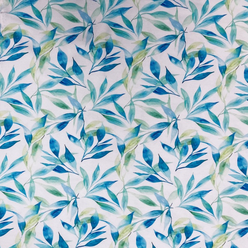 Smalribbad trikå med bladverk i blått o lite grönt. Bredd 135 cm. 95% bomull 5% elastan. 230g/m2