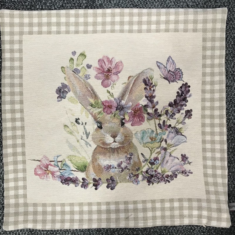 Kuddfodral ca 45x45 cm. Blixtlås i nederkanten. Tjusig dam med guldiga glittrande smycken. Beige baksida.